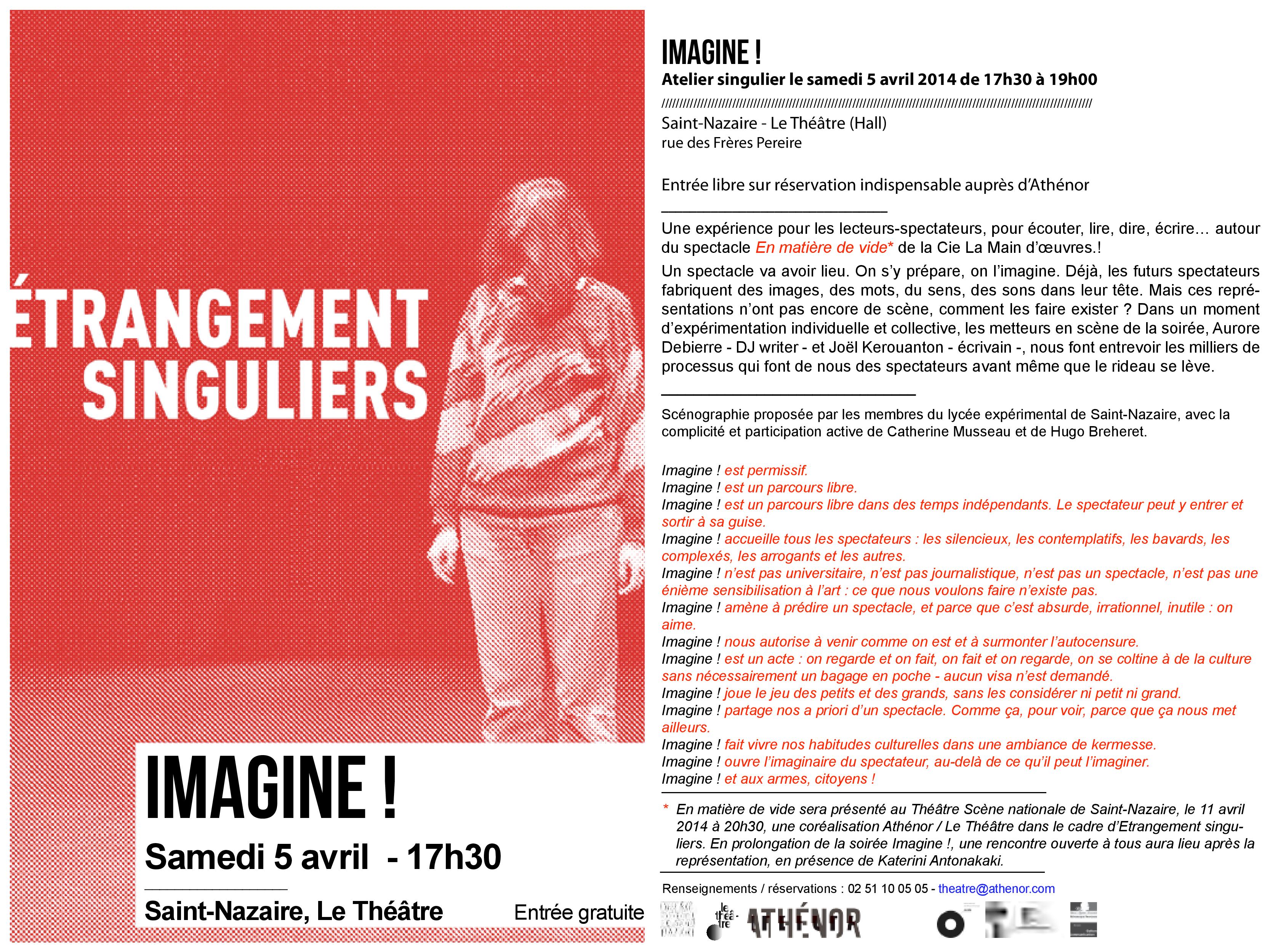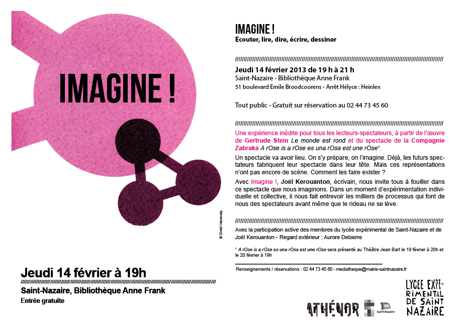 A partir d’une initiative collégiale avec le théâtre Athénor - scène nomade CNCM, la Médiathèque de Saint-Nazaire, le Lycée expérimental de Saint-Nazaire, s’est inventé Imagine !, une Kermesse culturelle autour d’un spectacle à venir. Une expérience pour lecteur-spectateur avant même que le rideau ne se lève.