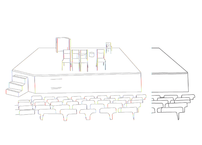 Lors d’une rencontre publique d’après spectacle, la troupe de Gérard Dubois expliquera par la voix de son éclairagiste Joe Keral que « la vidéo diffracte la scène du crime », qu’elle invite le spectateur à apposer son regard à Cours, Jardin, Fond de scène et même derrière lui, produisant dès lors un « public en mouvement face à l’inéluctable fixité du crime ». La vidéo est ici défendue comme langage autonome, susceptible effectivement « d’accrocher les jeunes » quitte à se situer dans le spectacle spectaculaire qui n’assume pas la spectacularité du théâtre. Nous aurions pu craindre une vidéo spectacle du crime, mais ici nulle illustration : la vidéo sert le propos, le tient.