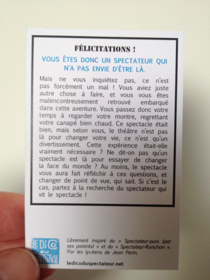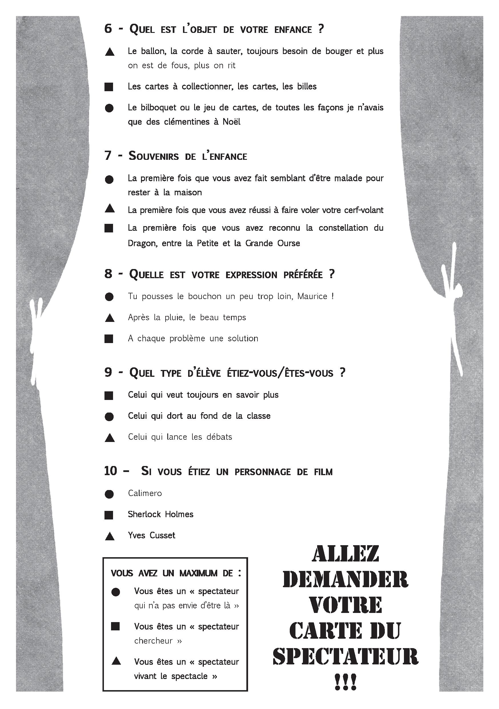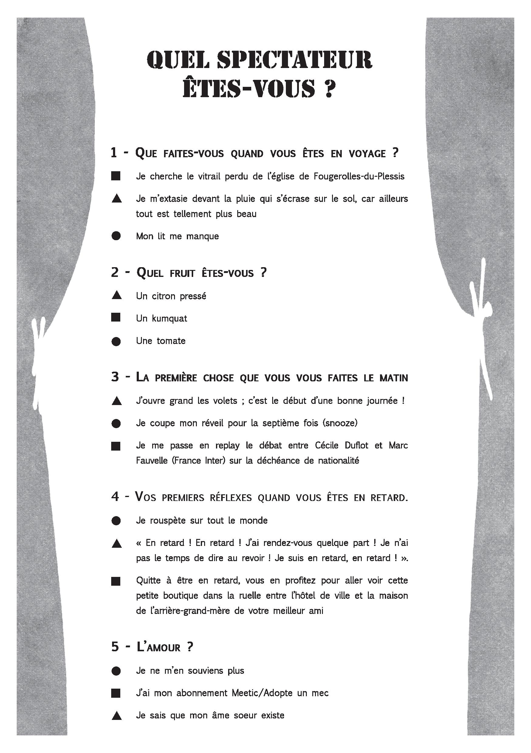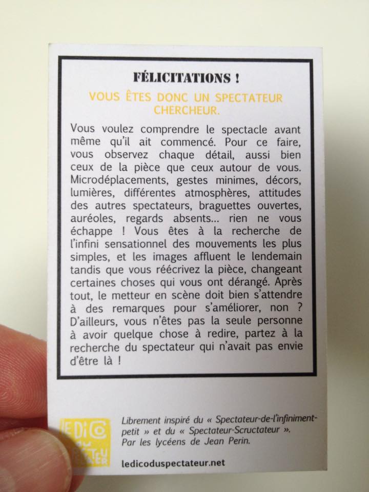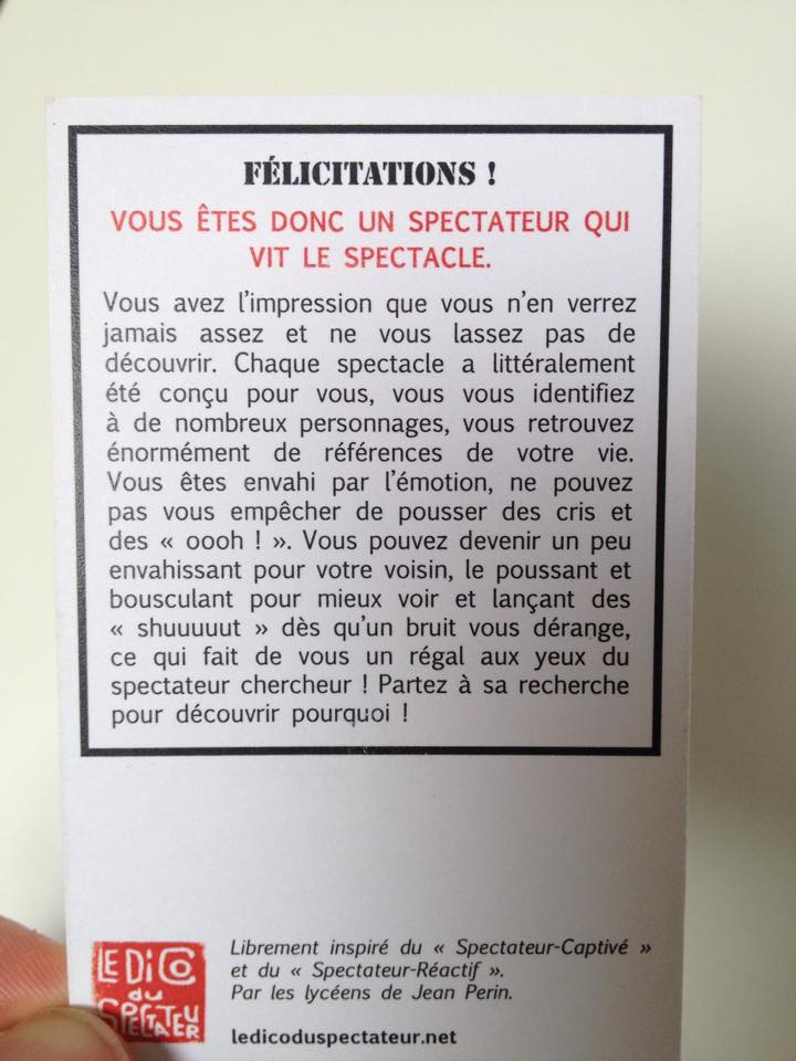 Et si le spectateur se moquait un peu de lui-même ? Librement inspiré du Dico du Spectateur, ce Quiz proposé par les lycéens de Jean Perin se pratique en ligne et lors des rencontres publiques.