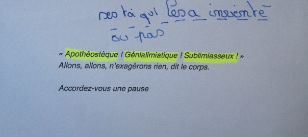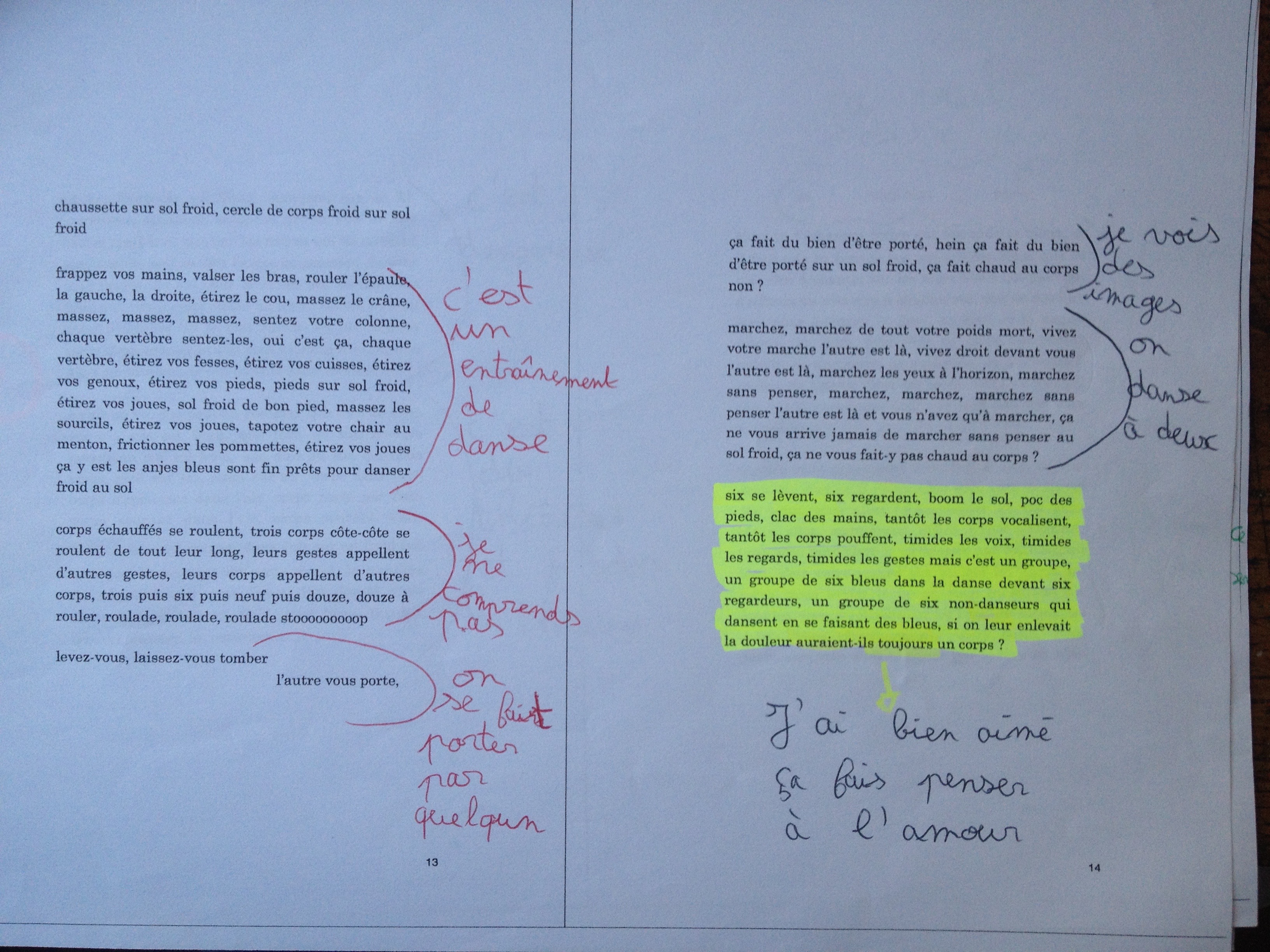 On ne leur a pas dit, aux enfants, qu’on faisait de l’expérimentation. On leur a dit qu’on cherchait. Que c’était quelque chose de collectif. Qu’on ne savait pas très bien où on allait mais qu’on allait ensemble. Qu’ils allaient pouvoir raturer les traces écrites par l’auteur invité : tant que le texte n’est pas fini l’auteur est dans la mouise. Là où les enfants iront le plus fort ce sera sur Cœur chaud sur sol froid, le récit épique d’un workshop en danse. Par leur commentaire ils construiront une vraie relation d’horizontalité