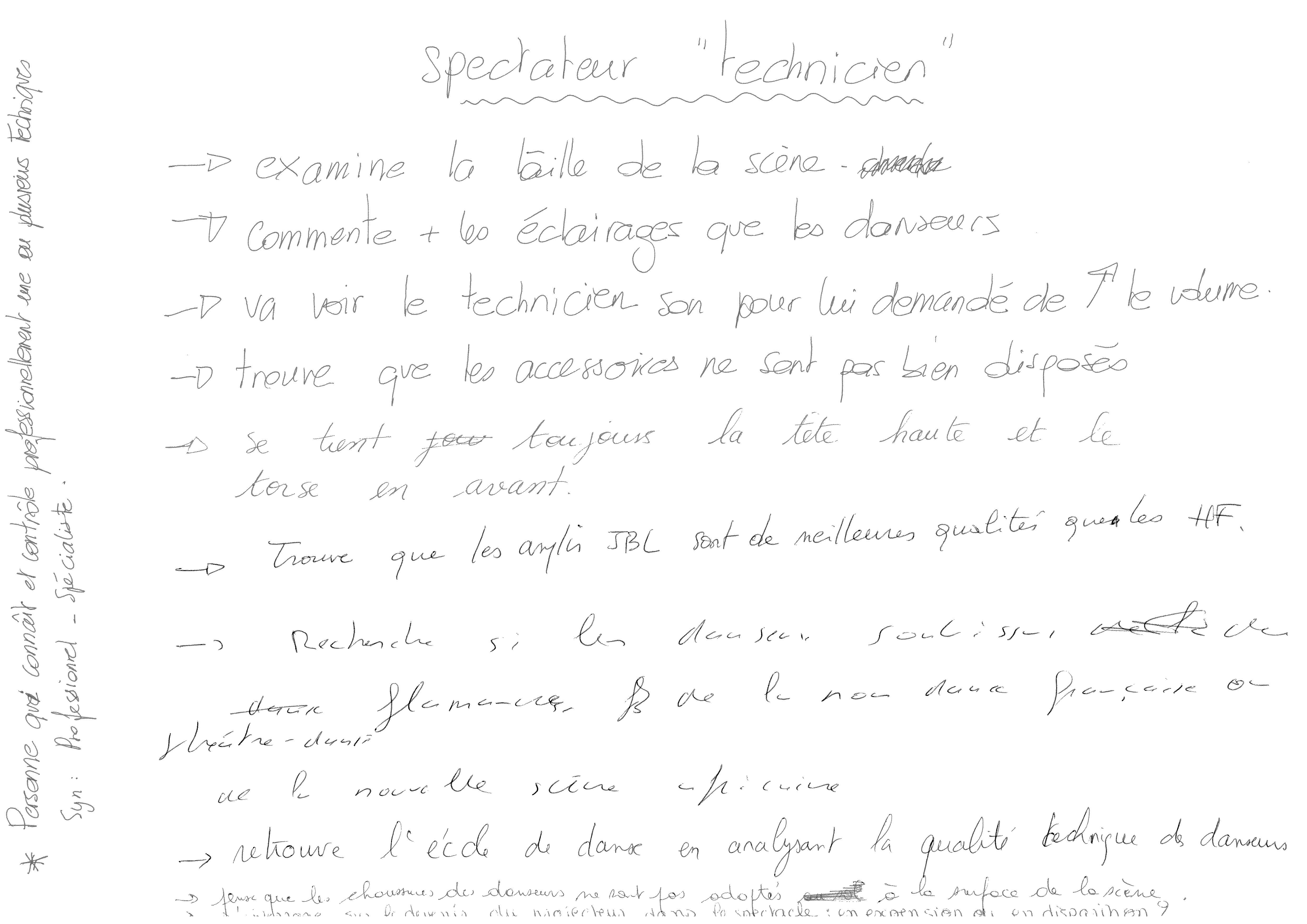 C’est dans cette ambiance que se déroulera le dernier workshop dansécriture, cette fois-ci en présence d’adultes — l’éducation artistique avec les enfants passe aussi par eux. La rature, toujours. Le corps qui danse et le corps qui écrit, encore. Sur des grandes feuilles à même le sol. Des définitions de spectateurs écrites par des écrivants-dansant (ou des danseurs-écrivants), fabriquées sur un immense plateau de théâtre, des définitions de spectateur polyphoniques et anonymes, sans intention initiale d’être partagées publiquement. Des définitions qui feront, pour voir le jour, l’éloge de la création partagée.