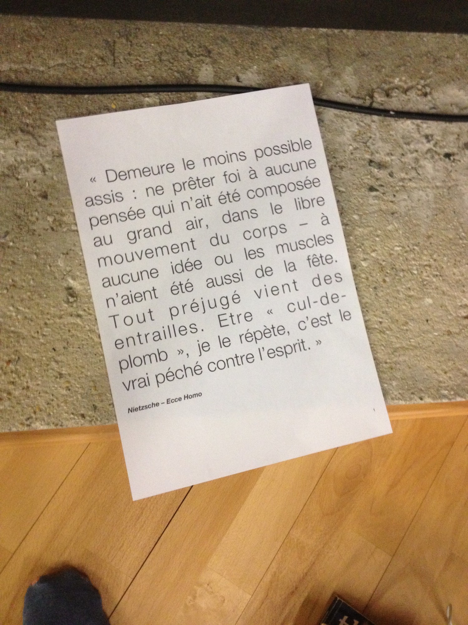 Après une journée dans le noir du studio, j’avais le bout des doigts insensible. On ne le dit pas assez, mais l’écrivain il joue du clavier, ivre, comme d’un instrument à percussion, jusqu’à ce que ses doigts saignent un peu. J’ai repris la route avec Nietzsche en tête, et son bel éloge de la marche : à pied jusqu’à la gare de Nantes, voyage debout dans le train, remarche à pied à Saint-Nazaire, de toute façon à partir de ce jour, j’avais décidé de demeurer le moins possible assis, de ne prêter foi à aucune pensée qui n’ait été composée au grand air, dans le libre mouvement du corps, à aucune idée où les muscles n’aient été aussi de la fête. Le cul-de-plomb, ça va un temps.