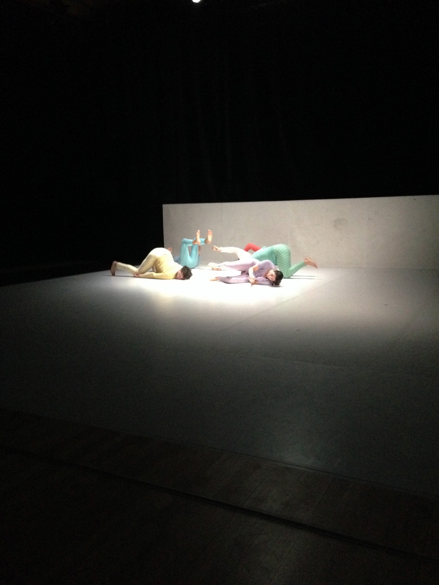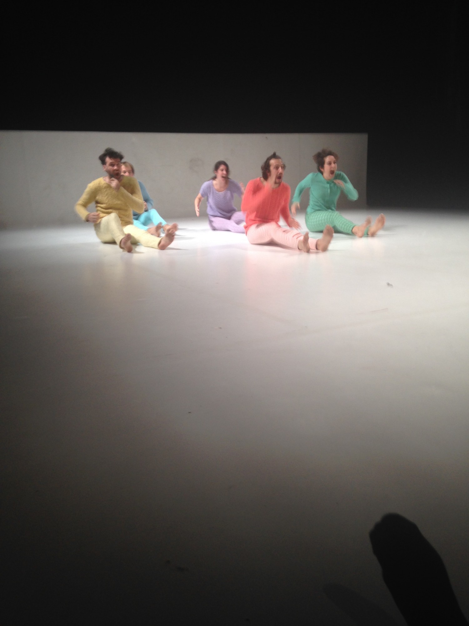 Notre bande d’hurluberlus saumonés (pour les couleurs des costumes et le côté bande de poissons des danseurs) cherche sa place ; s’amuse et endure la règle des chaises musicales. Un combat de coqs, où chacun s’épuise. Se dégonfle. Jusqu’à revenir en tortue.