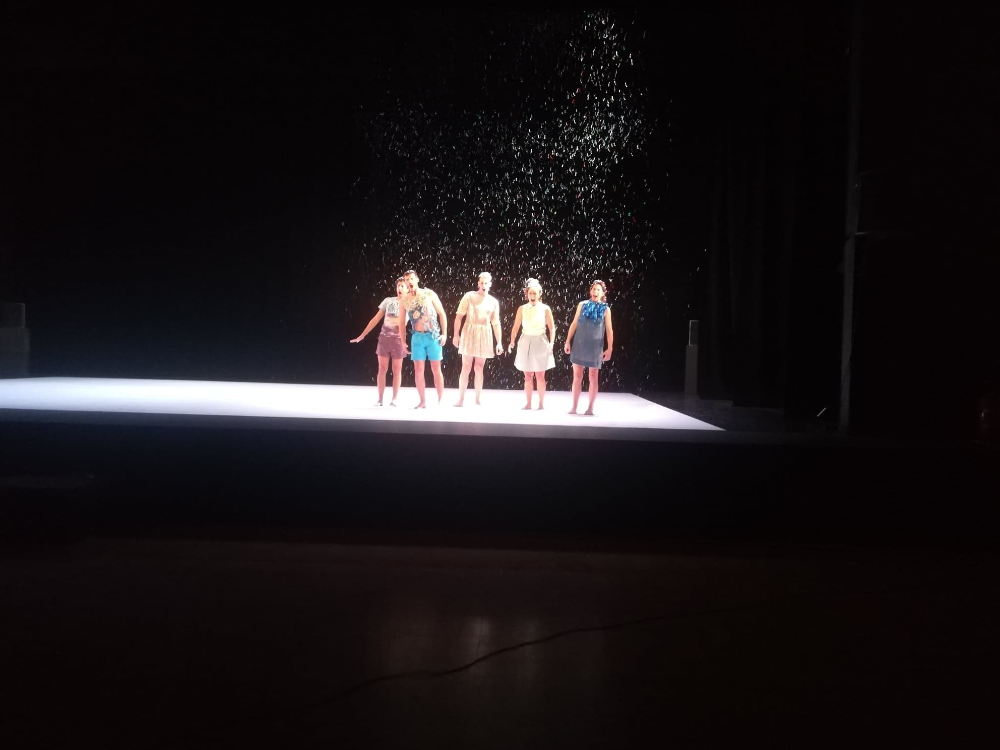 Je le pressentais, que la pièce allait être belle. À La Briqueterie, à quelques jours de la première, la mayonnaise a pris. Claire, puissante, drôle : la pièce était là. Et moi, seul spectateur de cet avènement, je n’ai su qu’applaudir fort et crier Bravo !! Bravo !! Bravo !! Pas pu en dire davantage que « c’était bien », « c’était vraiment bien » et de constater que mon propos faisait un peu flop. Le chorégraphe et les danseurs étaient surpris : ils avaient tant de choses à affiner d’ici à la première qu’ils ne pouvaient pas s’enthousiasmer. J’avais envie de leur dire, aux artistes : la pièce est faite ! Voilà, ça y est ! Mais non. Ils ne voulaient pas trop entendre cela, tant les raccords étaient encore nombreux à peaufiner entre les séances. Et puis il y avait les costumes (une pièce de crochet à poser sur chacun des vêtements), les tombées de neige (des tops à préciser), la musique (des rajouts à faire, impossibles à réaliser tant que la chorégraphie n’est pas fixée). La to do list était longue et contrastait avec mon état joyeux, presque flottant, comme si j’avais bu. Voilà, c’était ça : la pièce produisait chez moi une légère ivresse, la plus belle, celle qui fait décoller le corps sans alourdir la tête, celle qui provoque le sourire permanent et l’envie de danser. La transedanse de MASCARADE, par sa contagiosité joyeuse, provoquait la transedanse du seul spectateur en présence que j’étais. Enfin, une transedanse mentale face à la transedanse du plateau. Et je trouvais que les transedanseurs, en fin de pièce, n’avaient pas terminé leur job. Je les aurais bien vus sauter dans la fosse et poursuivre leur geste avec le spectateur, tournoyer de concert jusqu’au bout de la nuit.