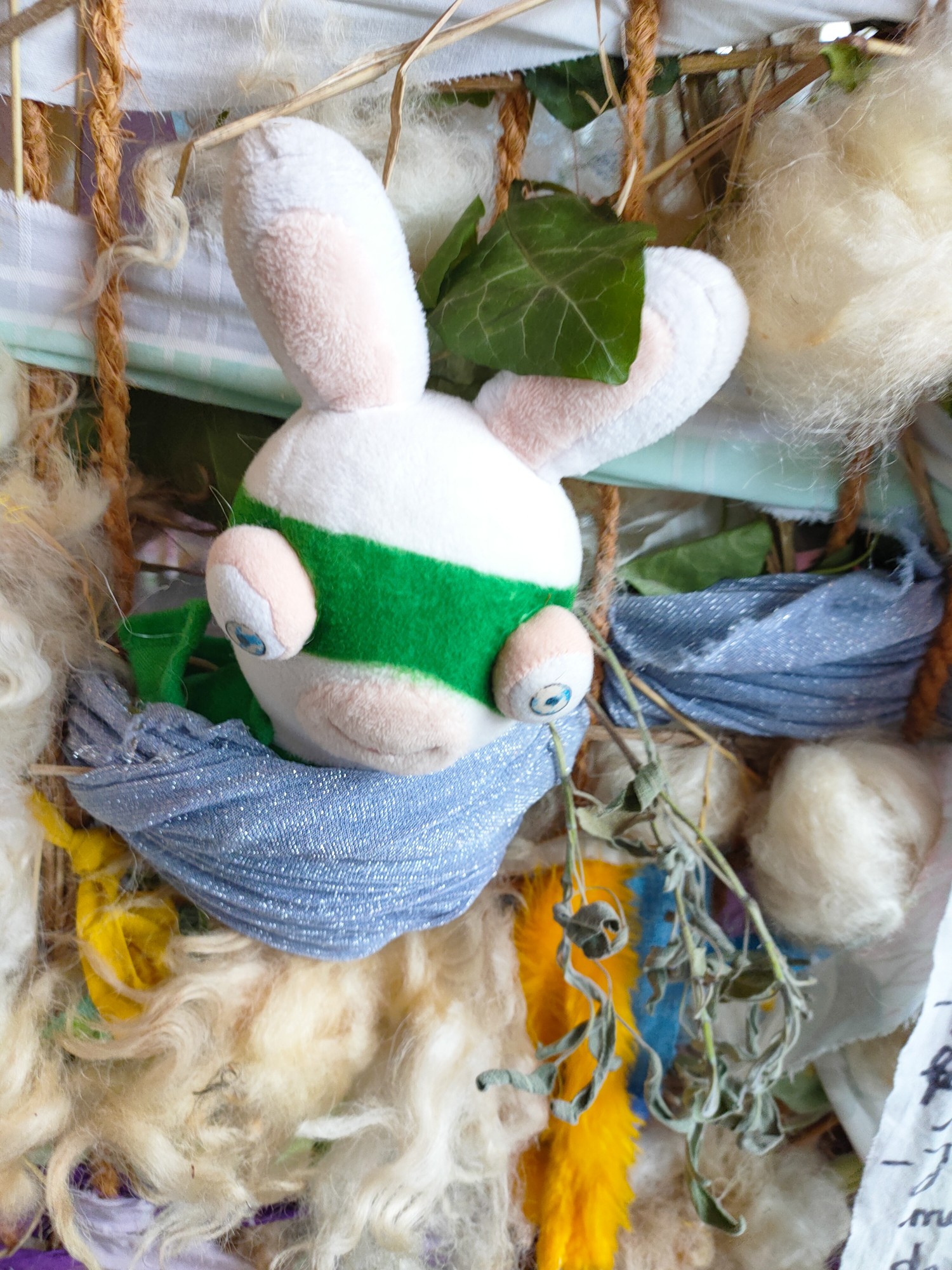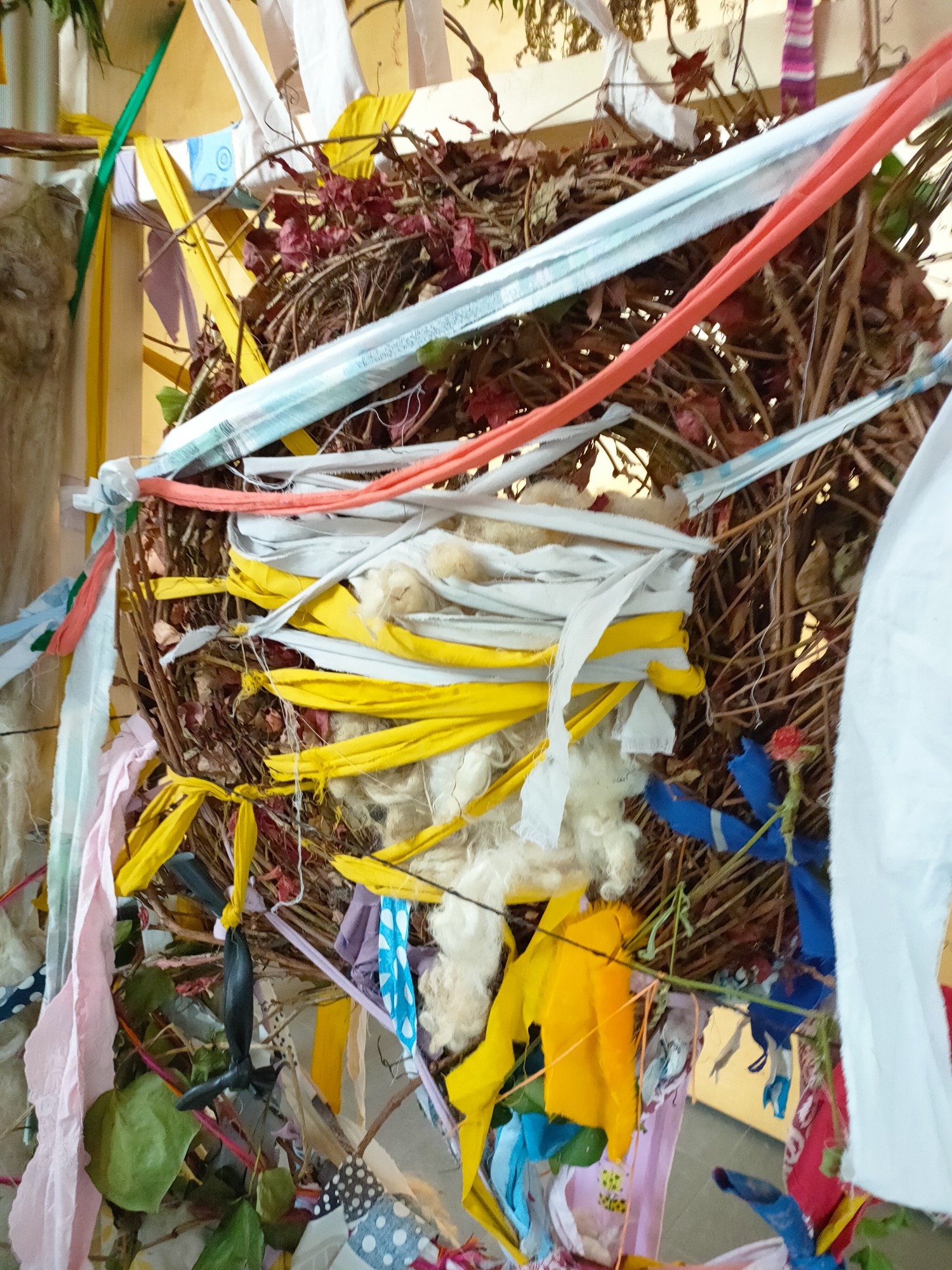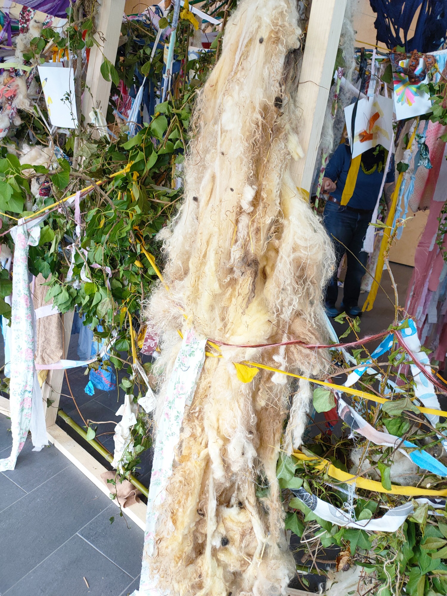 Du tissu partout ? Pas que : on y déniche aussi du caoutchouc, et de la vraie laine de mouton, du jamais-vu dans un théâtre, est-ce une cabane réservée à l’aïd-el-kébir, où le mouton symbolise foi et partage ? Peut-être. Ou pas. Vraiment, on ne sait pas. Et ces brindilles ! Maintenues par une ossature solide, presque une petite forêt en miniature. C’est pour ça que cette cabane mérite son nom d’œuvre.