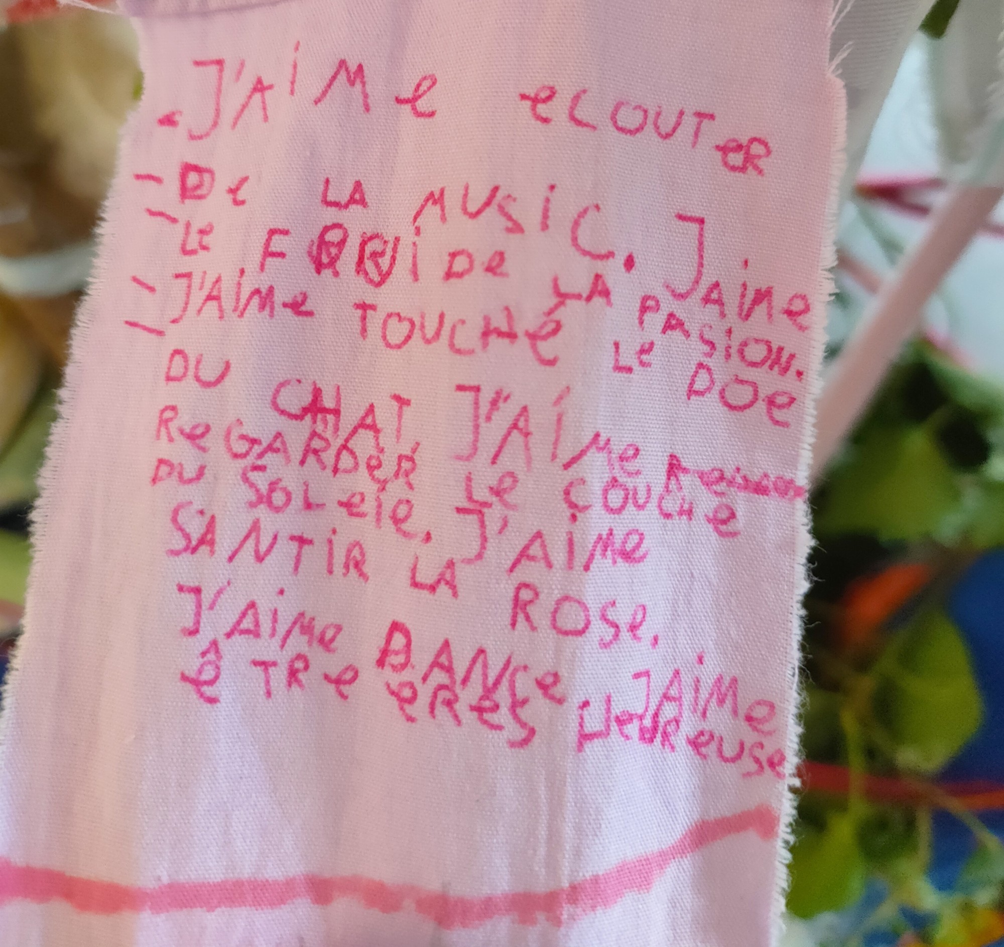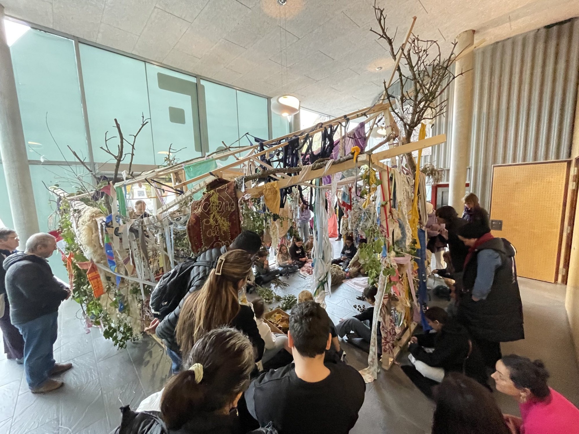 Chaque matériau possède son odeur, comme si l’œuvre n’était pas seulement visuelle mais aussi olfactive — une véritable cabane à arômes. Et cette odeur se mêle au parfum des mots : certains tissus contiennent des poèmes écrits pendant la semaine Signatures.