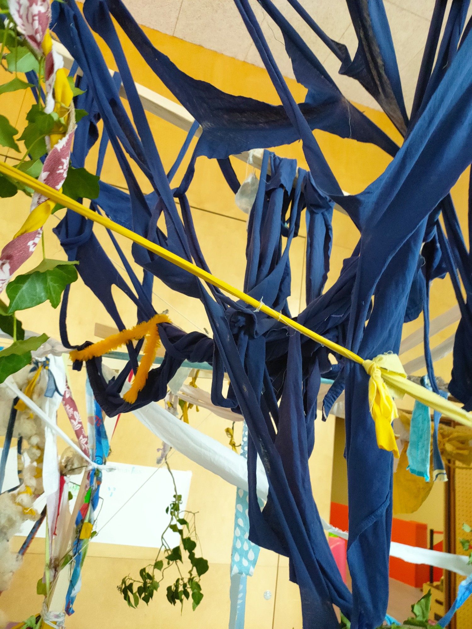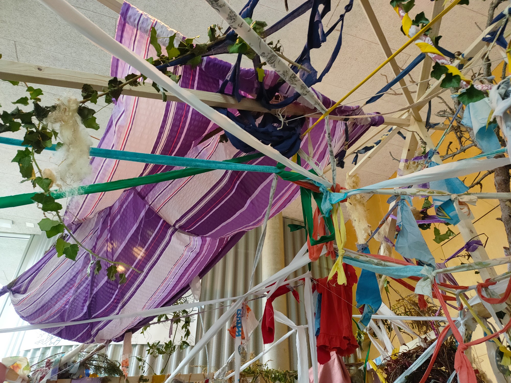 La cabane est de taille moyenne, un peu petite, pas super grande. On n’est jamais complètement dedans. On est autour, dehors, ou dessous — un peu comme un jeu d’habitation pour enfants… et pour adultes. On y est enveloppé·e de tissus partout, partout, partout, si denses qu’on ne peut en avoir une vue complète. Ces bandes de tissu récupéré forment presque une toile d’araignée surmontée d’un ciel bleu étoilé.