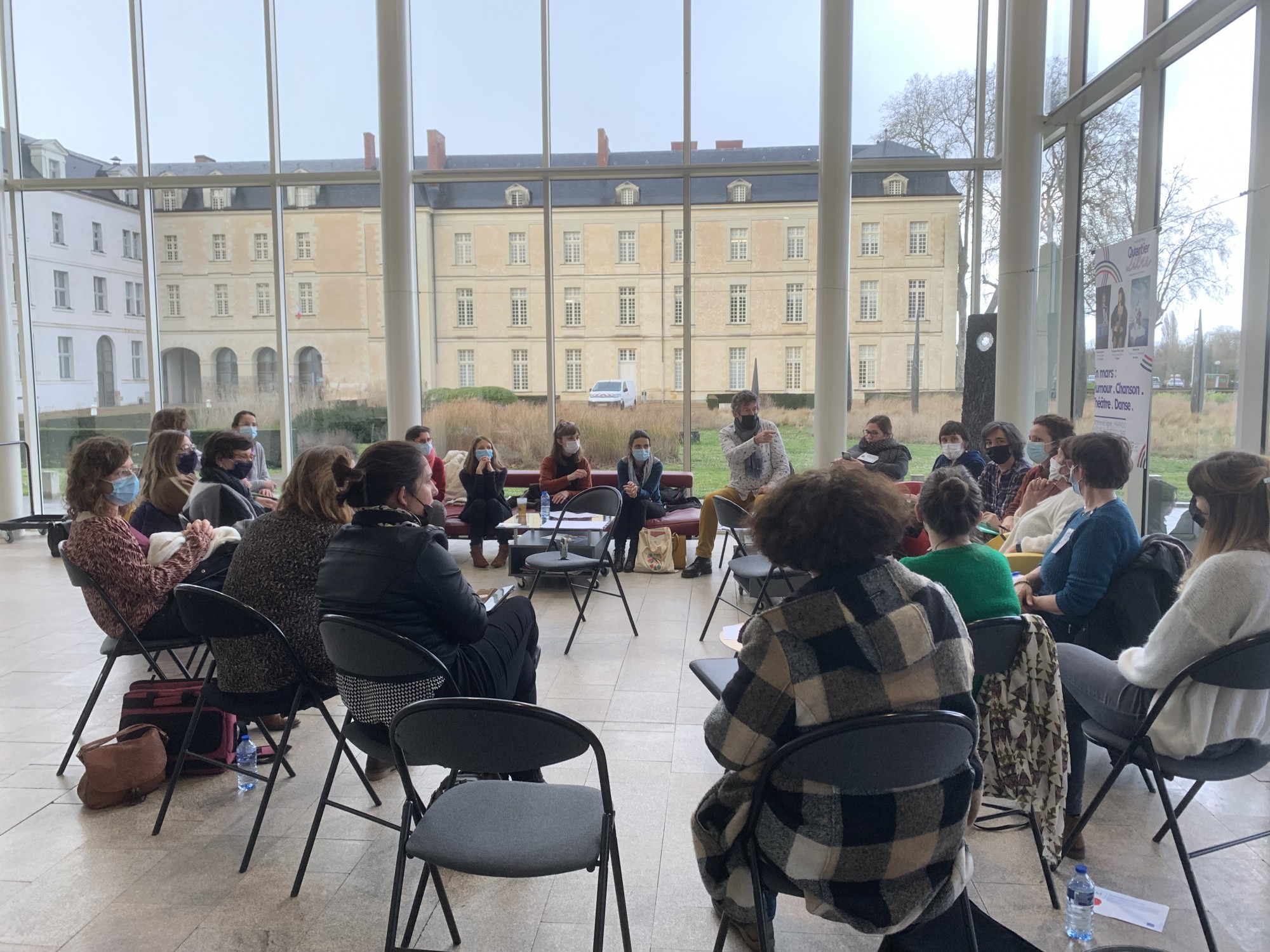 Patatras : because Covid-19, les personnes âgées n’ont pu se rendre au théâtre. Les ados, quant à eux, ne pouvaient pas se mélanger à dʼautres classes, voire se mélanger tout court. Les échanges ne pouvaient avoir lieu que dans la salle de spectacle, assis, bien à sa place, pendant quelques minutes précédant le « Bord de plateau ». Nous voilà donc une trentaine d’adultes (stagiaires et formateurs-trices) à circuler rang par rang à la rencontre dʼados affalés comme au cinéma. Eux, assis dans ces beaux fauteuils rouges, et nous, debout, face à eux, leur tendant des perches pour se représenter leur réception et donnant parfois la nôtre, de réception, pour lancer la conversation.