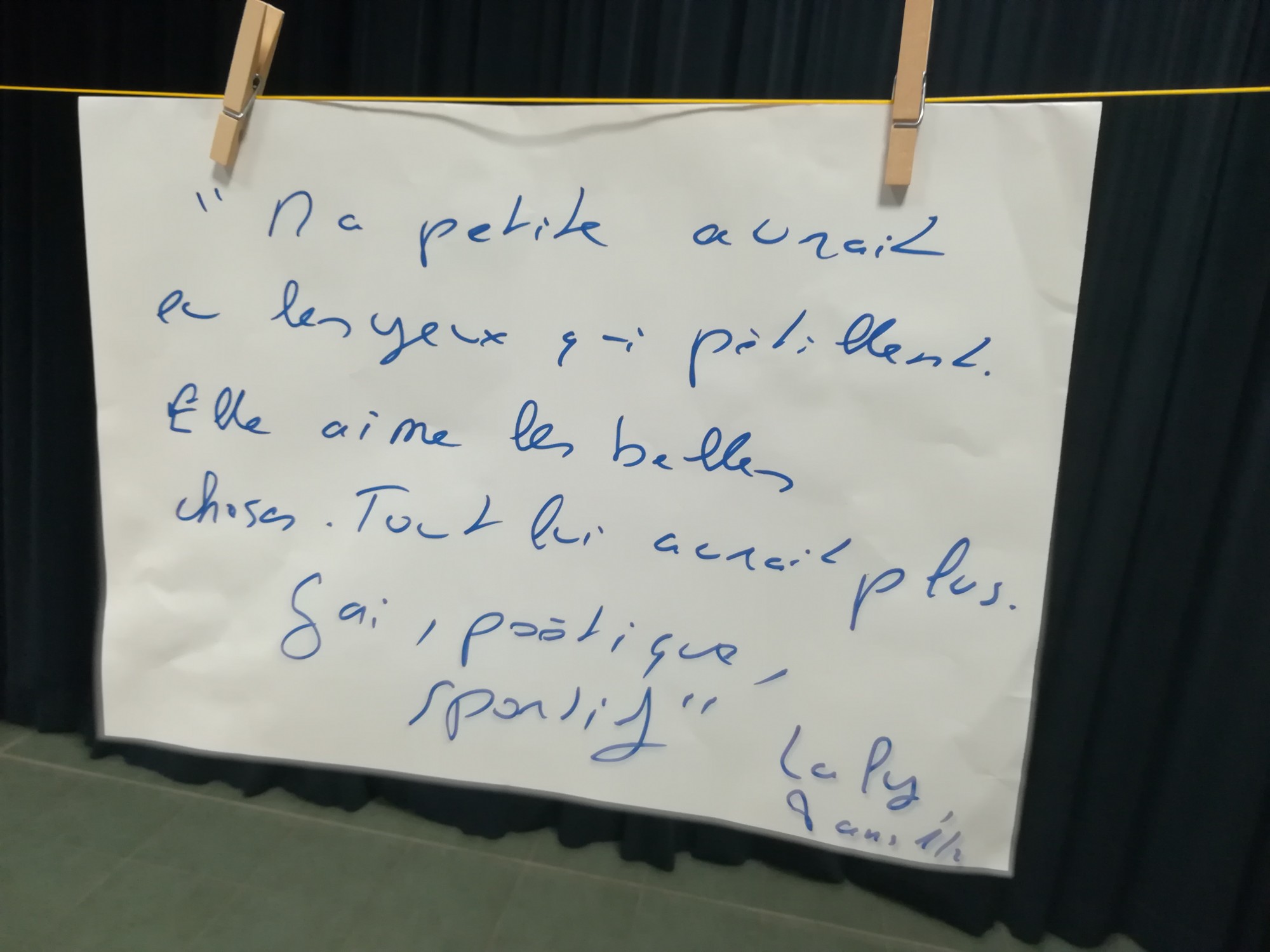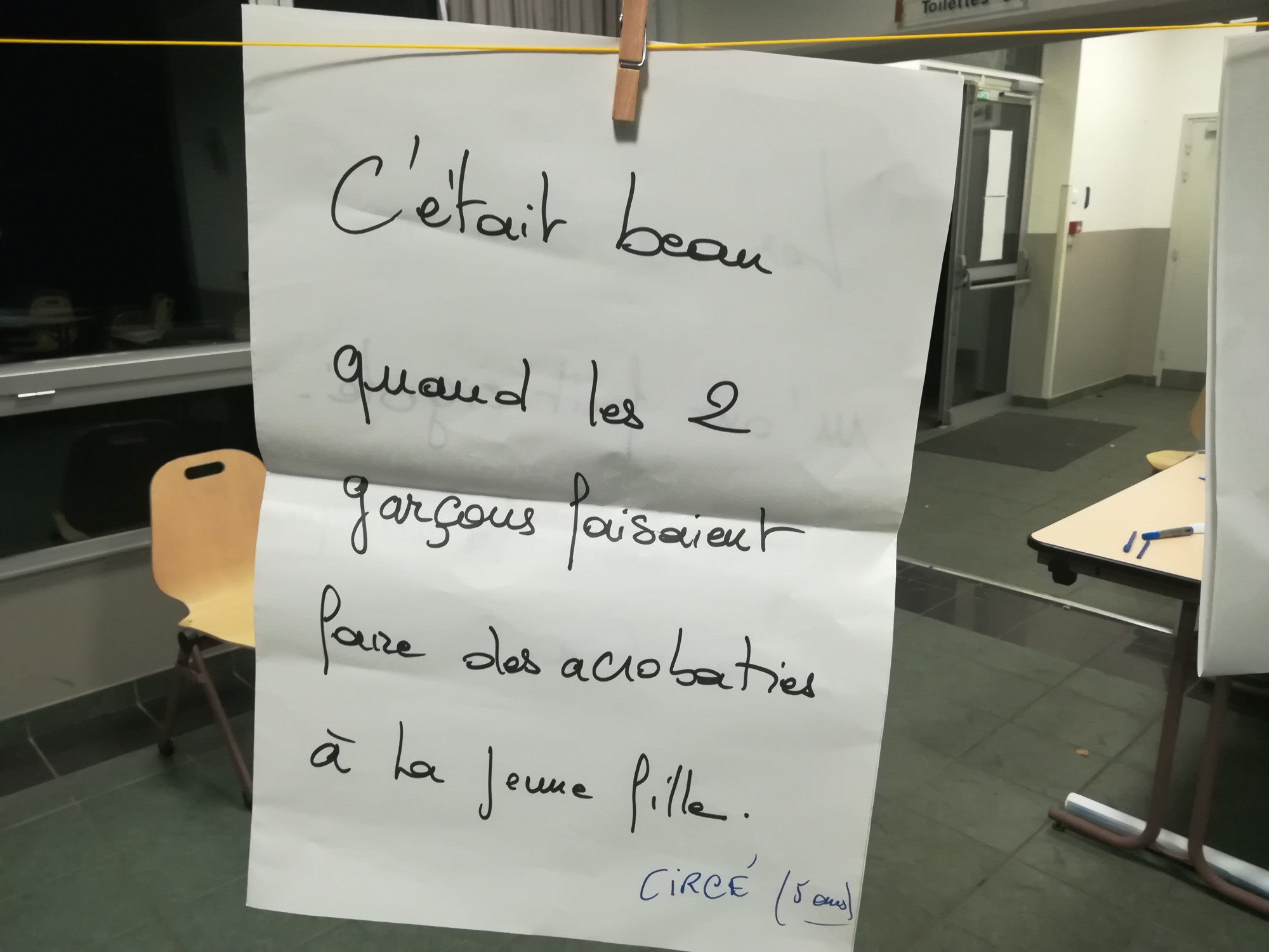 Drôle, le spectacle Avril ? Oui. C’est du moins ce qui apparaît au fil des témoignages des spectateurs, notamment le comique de répétition d’Isild (cinq renversements d’une tasse de chocolat) avec en contrepoint les situations répétées du père (appels récurrents à Monsieur Pick, professeur des écoles, pour signaler l’absence de son fils).