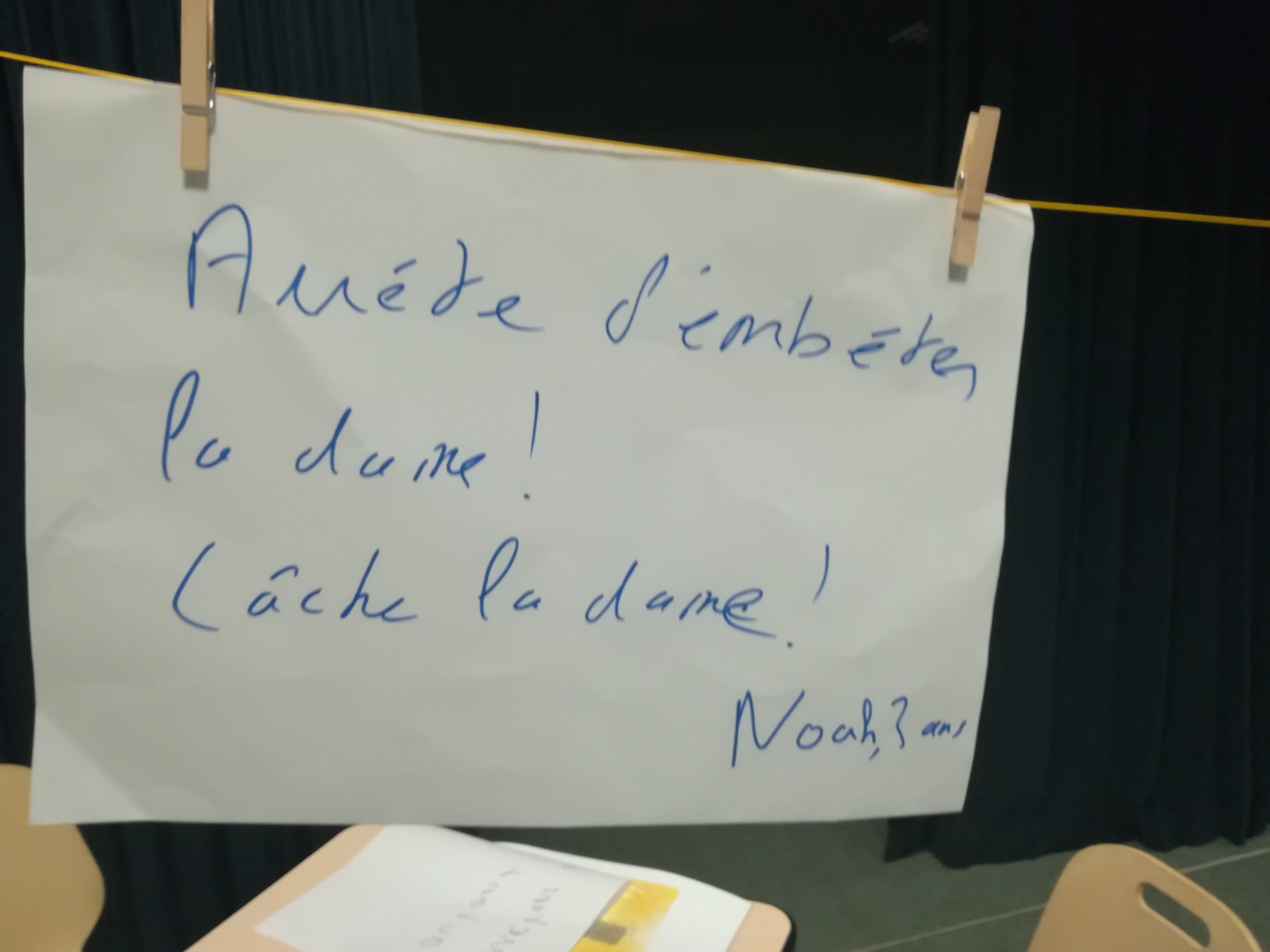 « Pendant le spectacle MLE…, un jeune spectateur a fortement interpellé un acteur : ”Lâche la dame ! Lâche la dame ! Lâche la dame !” lui a-t-il crié, alors que le personnage agressait un autre personnage sur la scène du chapiteau. Ce spectateur avait trois ans à tout casser. Il avait tout compris aux arts de la scène : il savait que le spectacle, même si “c’est pour de faux”, déroule des vérités. Je l’aurais bien élu “spectateur de l’année”. »