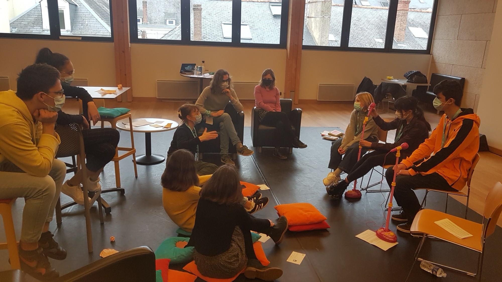 Le Bord de scène commença par la mise en avant du regard lavalois (on ne la lui fait pas ) : « Les volets étaient bleus dans la bande-annonce ; dans le spectacle, les volets sont rouges, pouvez-vous nous expliquer ce changement ? » On apprendra qu’un artiste s’est coupé la paume de la main pendant la répétition, le sang giclait de partout : la troupe a préféré repeindre tout en rouge, par souci esthétique et sur conseil du scénographe présent ce jour-là — une chance. La question désorienta quelque peu les artistes, qui décidèrent de mener la rencontre et attaquèrent le public lavalois par une critique en règle, « pas réactif », « mou », « pas très fun », même s’ils reconnurent dans la foulée, sous les sifflets qui commençaient à arriver, que le public a applaudi comme rarement le spectacle au moment du baisser de rideau.