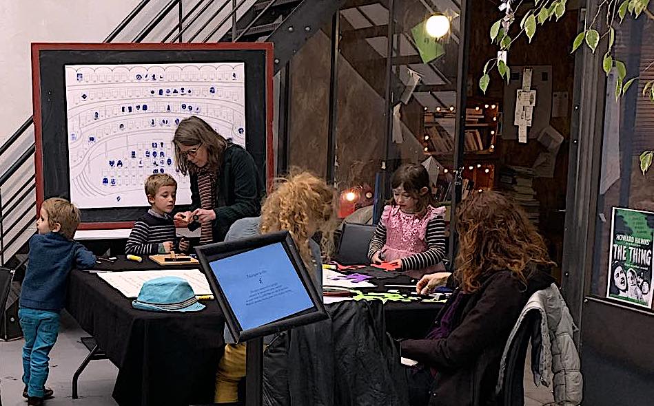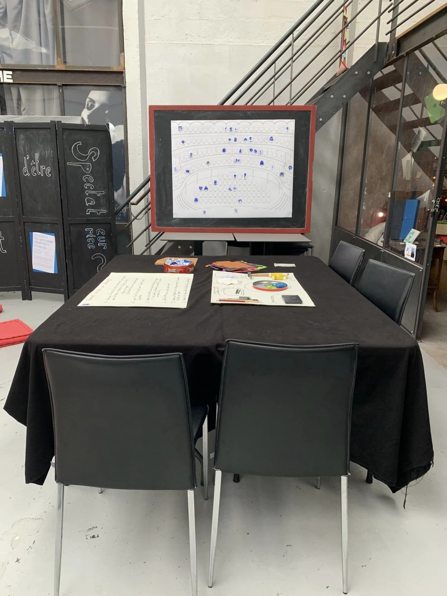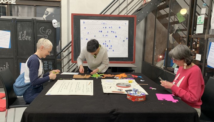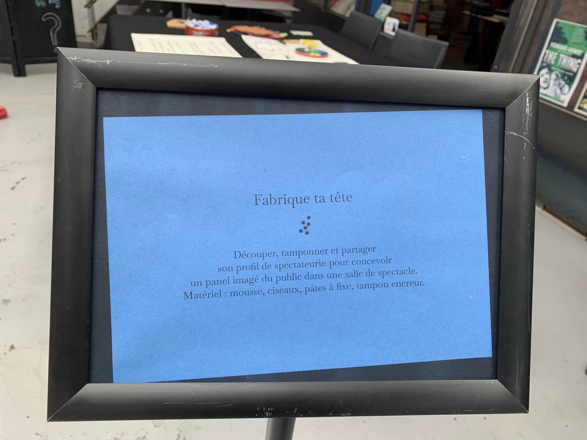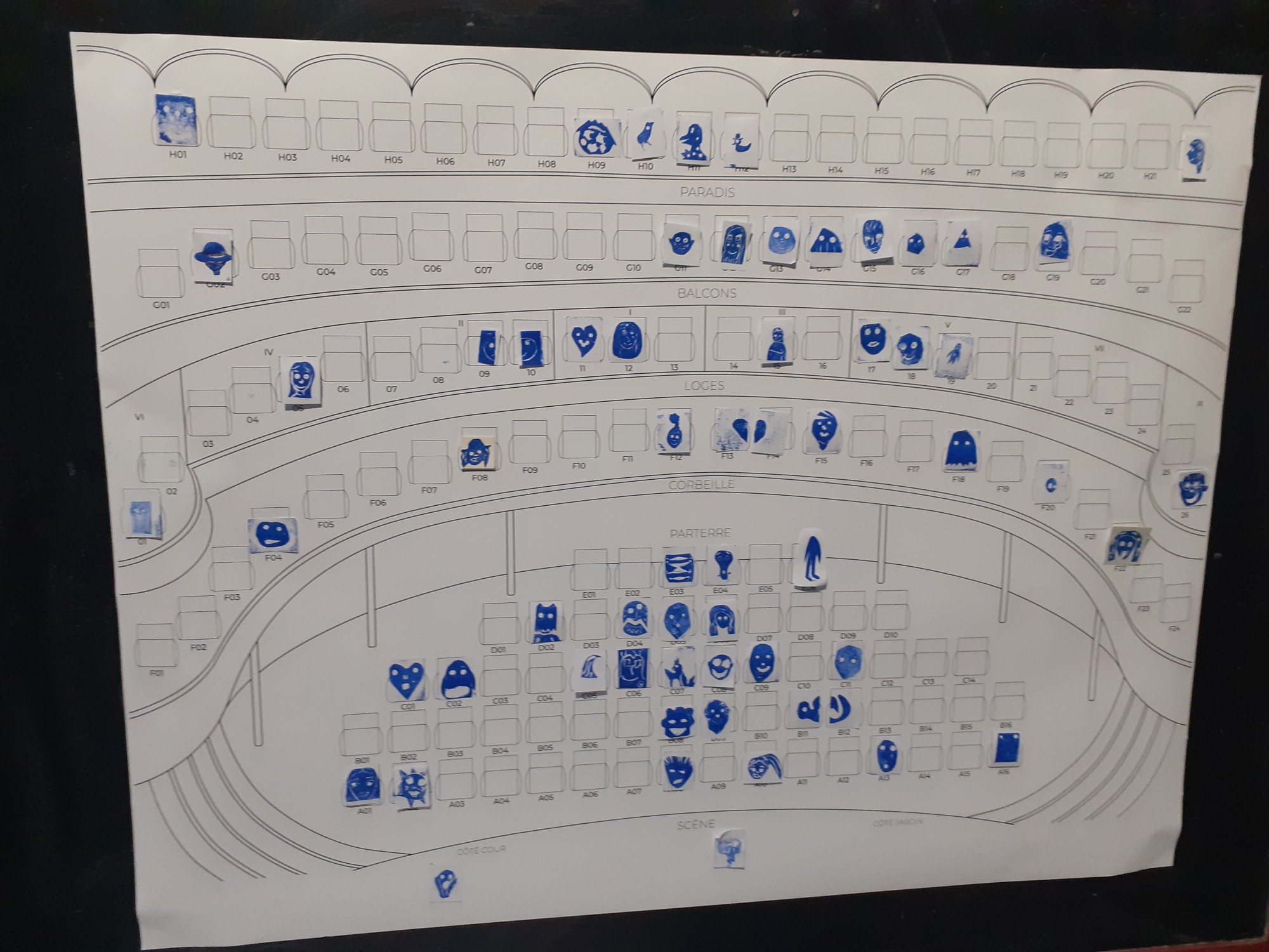 Découper, tamponner et partager son profil de spectateurice pour concevoir un panel imagé du public dans une salle de spectacle. Matériel : mousse, ciseaux, pâtes à fixe, tampon encreur.