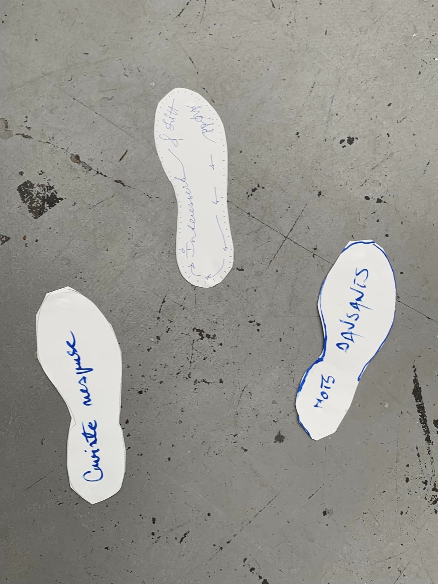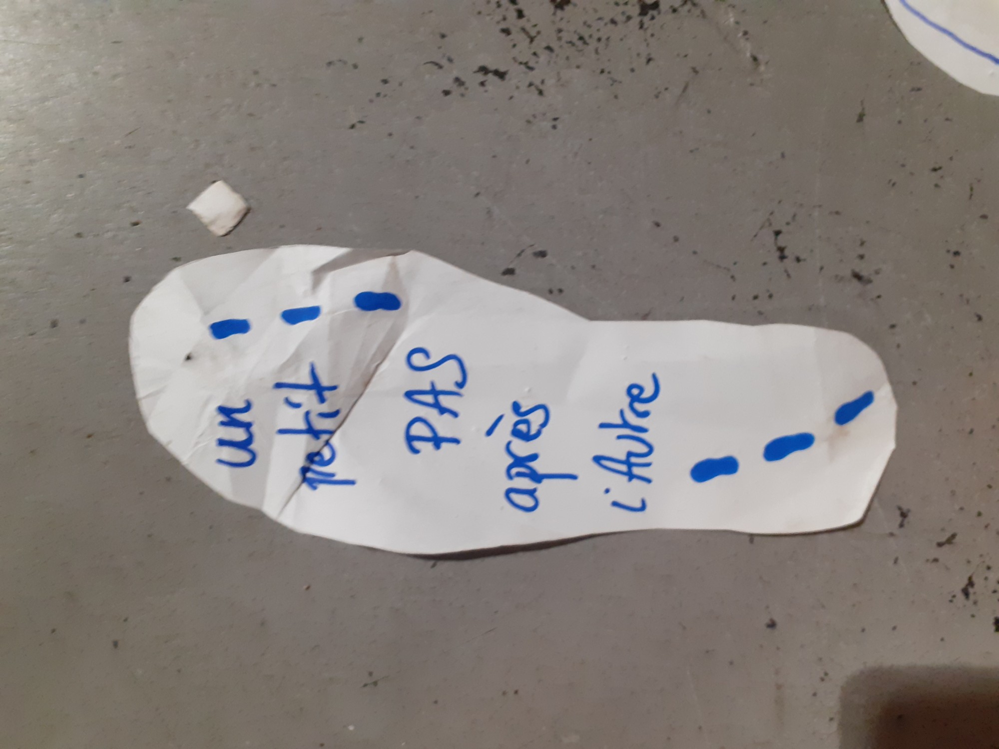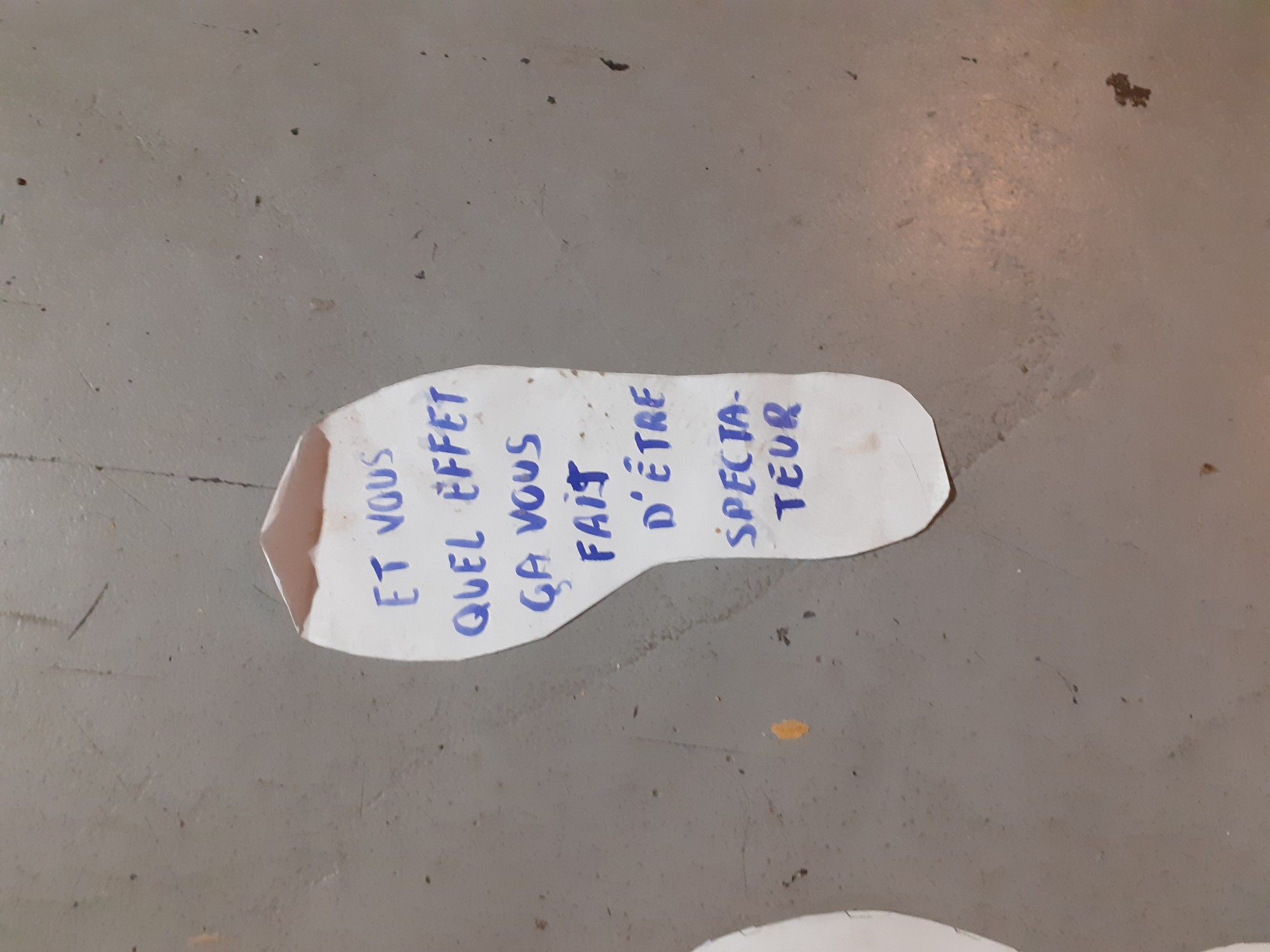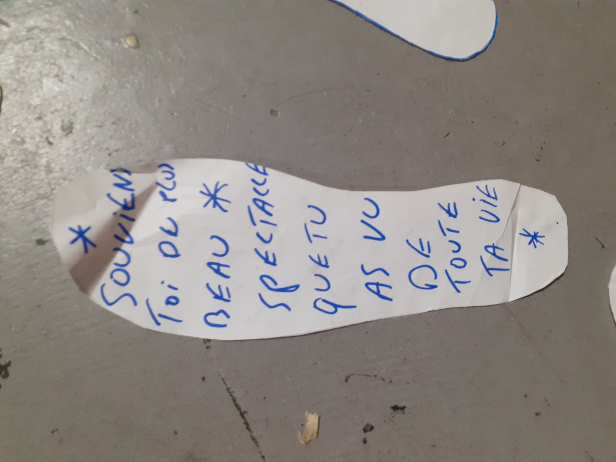 Création collective d’un chemin, fait de traces de pas collectées pendant l’ouverture des festivités. Chacun·e est invité·e à poser un pied chaussé sur une feuille blanche, à tracer le contour puis à découper la trace restante. Invitation à écrire des mots à l’intérieur de la trace, comme des flux de pensée qui parcourt le vivant des spectateurices.