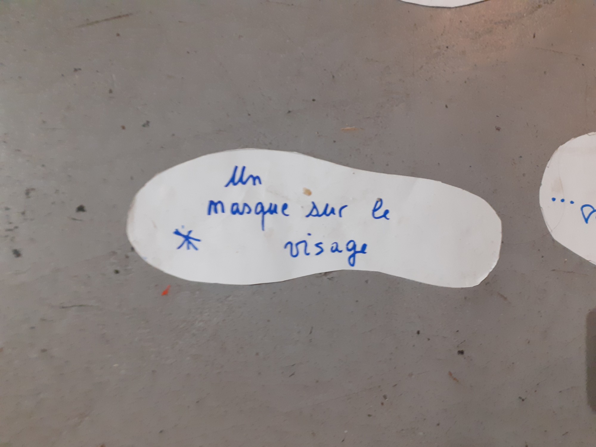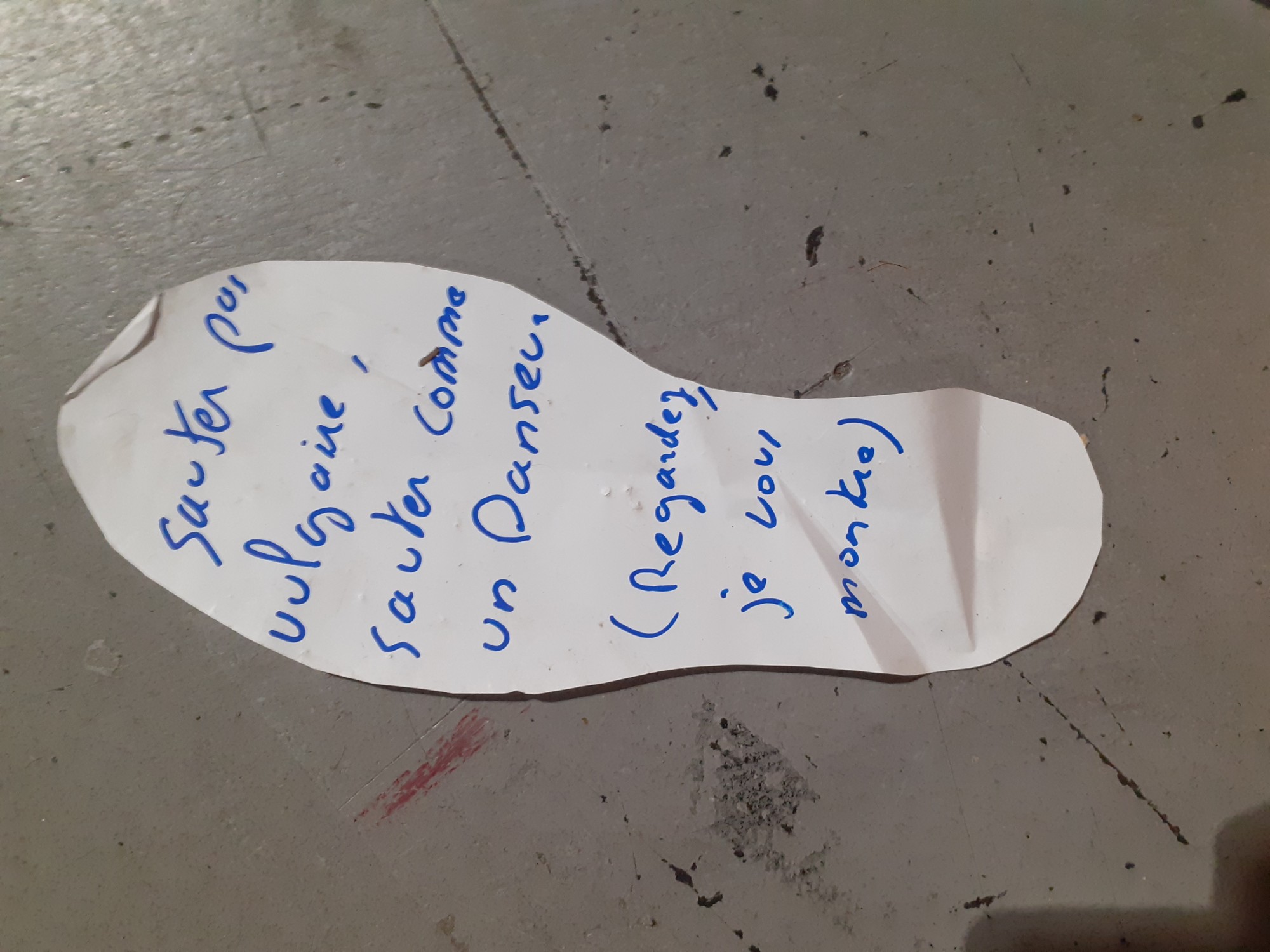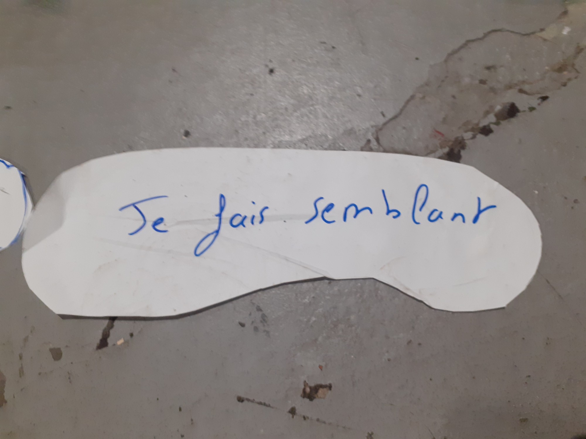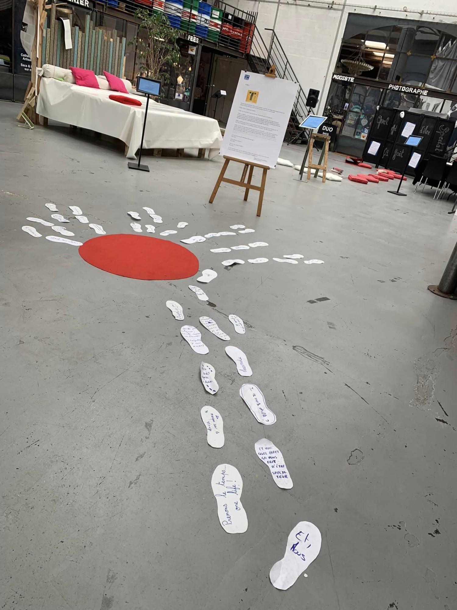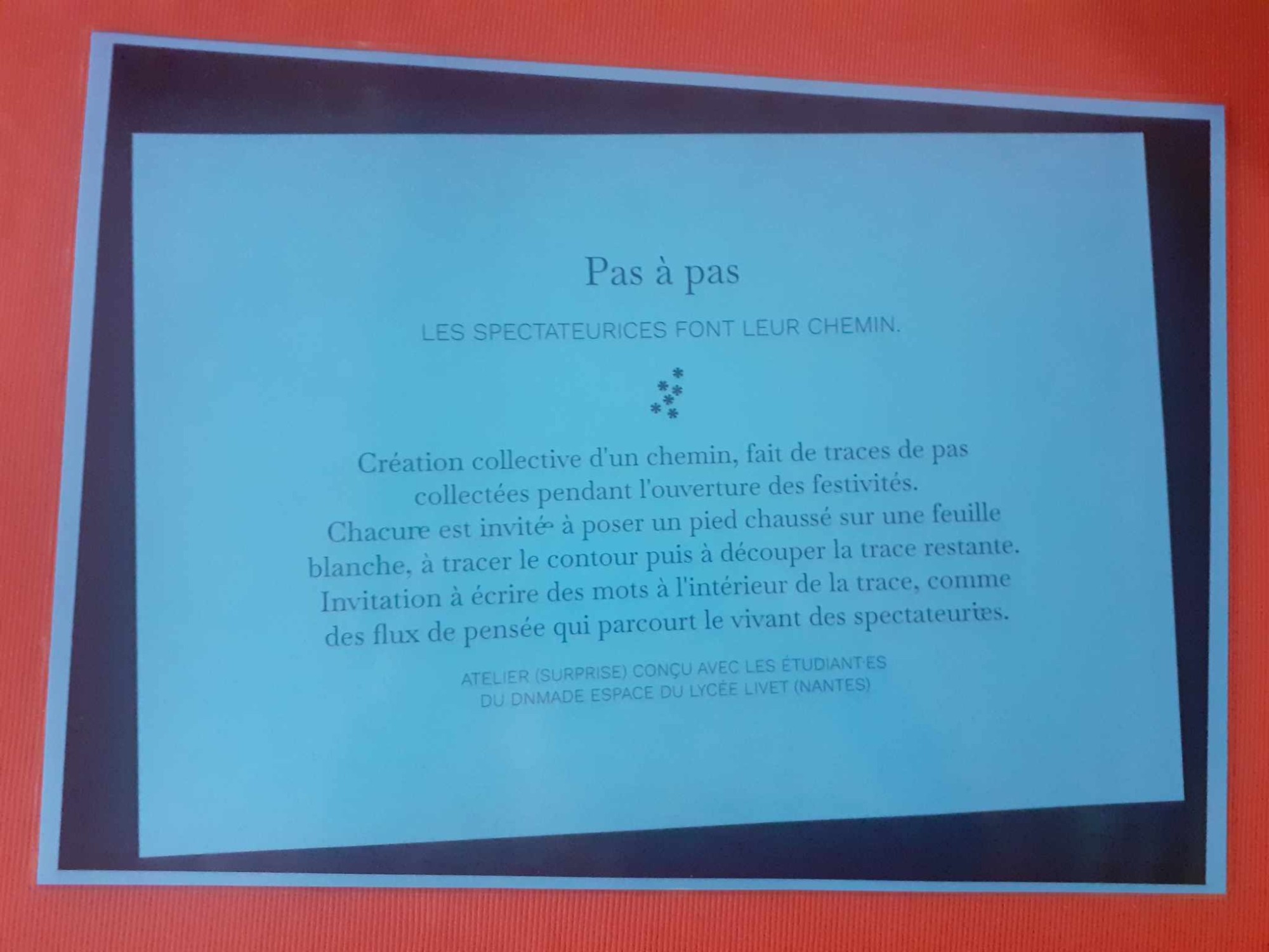 Création collective d’un chemin, fait de traces de pas collectées pendant l’ouverture des festivités. Chacun·e est invité·e à poser un pied chaussé sur une feuille blanche, à tracer le contour puis à découper la trace restante. Invitation à écrire des mots à l’intérieur de la trace, comme des flux de pensée qui parcourt le vivant des spectateurices.
