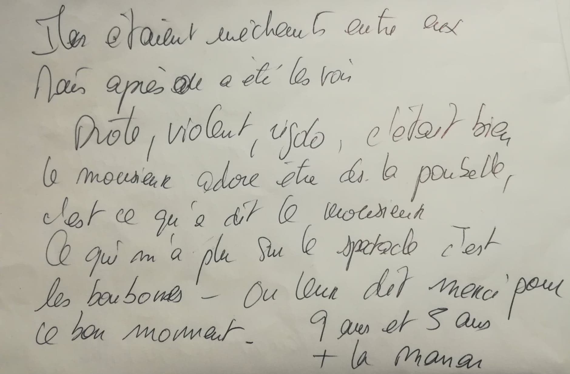 Et c’est vrai qu’au début tu rigoles, a renchéri un spectateur bien adulte, et tu te dis que les personnes en situation de handicap se marrent bien entre elles, et voilà, on ne les voit plus comme handicapées, Extension réussit une mise en valeur complexe du handicap, on se marre aussi quand ils invitent le public à leur tirer dessus avec des boulettes en papier, le public leur tire carrément dessus, et il se marre, Extension c’est un jeu punk, c’est tout le temps un jeu punk, le jeu punk du spectacle et de la vie, le jeu de la résilience, de l’acceptation de la différence où le public se dit qu’il a peut-être mal agi à un moment donné avec ses boulettes en papier, il réfléchit, le public, pourquoi a-t-il lancé des boulettes en direction d’une personne handicapée, il se le demande, presque gêné d’en rire.